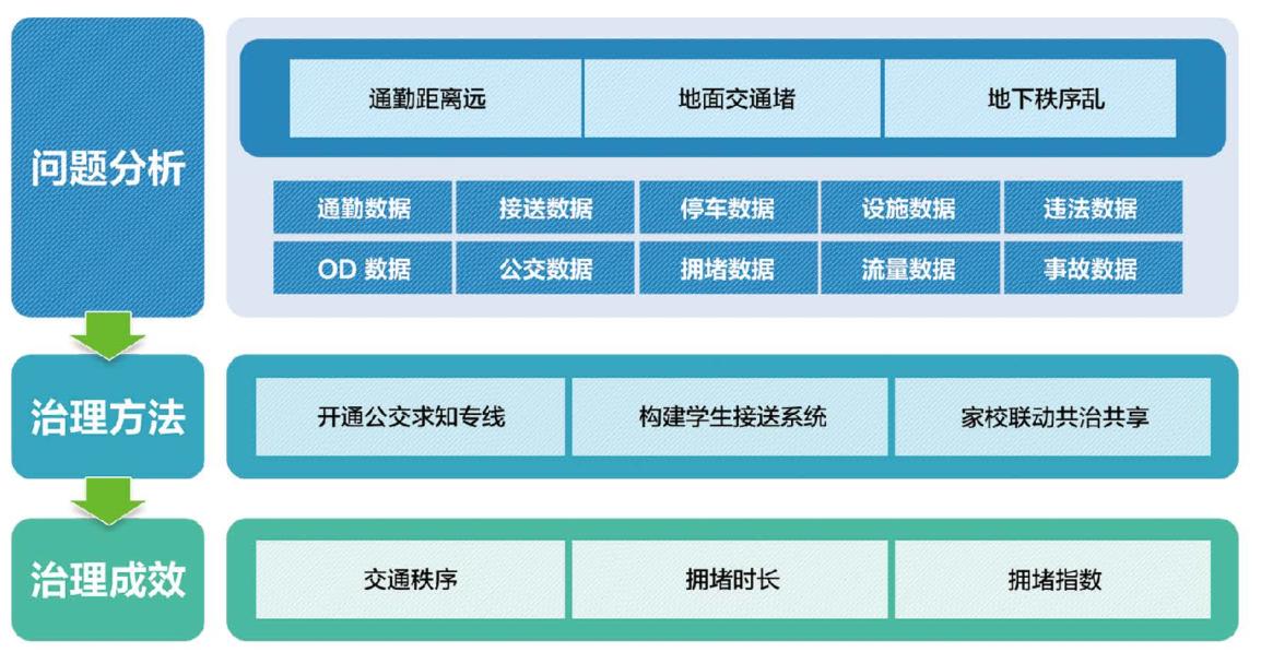 从学校周边交通存在的实际问题出发,采用“1+X”治理方法,通过数据分析明确学生居住分布,抓住解决上下学瞬时交通吸引的“1”这个主要矛盾,采用开通公交求知专线、构建学生接送系统、家校联动共治共享等“X”项措施,打造时空分离、人车分离的学生上下学立体接送系统,形成学校周边安全、有序、畅通的交通环境。
