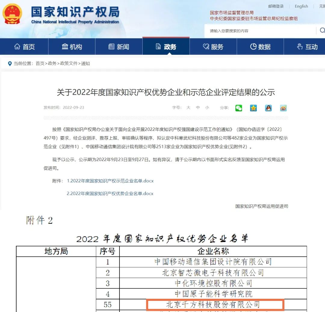 日前,国家知识产权局公示了“2022年度国家知识产权优势企业和示范企业评定结果”。千方科技经层层评选,荣获“2022年度国家知识产权优势企业”称号,科技创新能力再获认可。