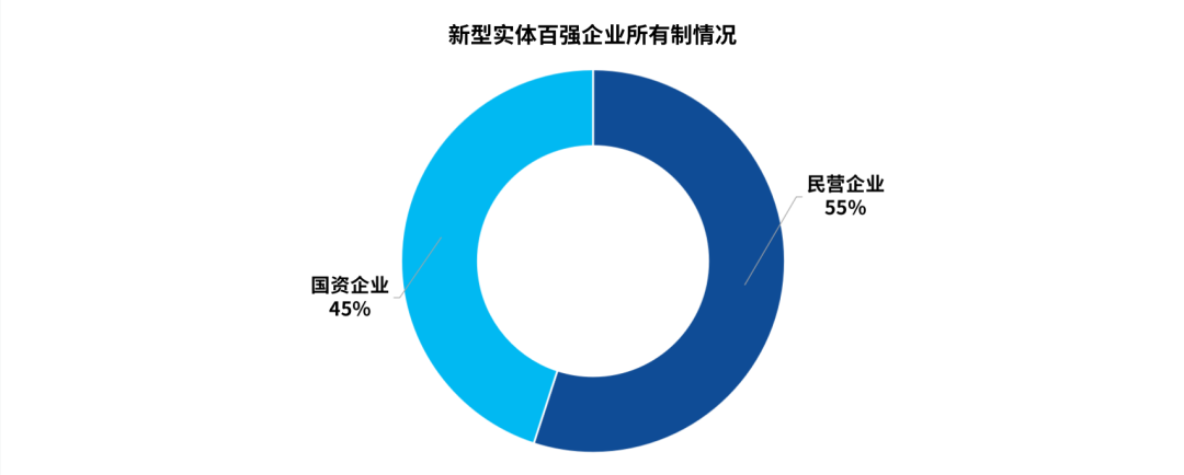 2022新型实体企业100强中,民营企业与国资企业具备各自优势,各有分工、相得益彰,共同发挥出重要作用,其中民营企业55家,国资企业45家(包括央企20家)。