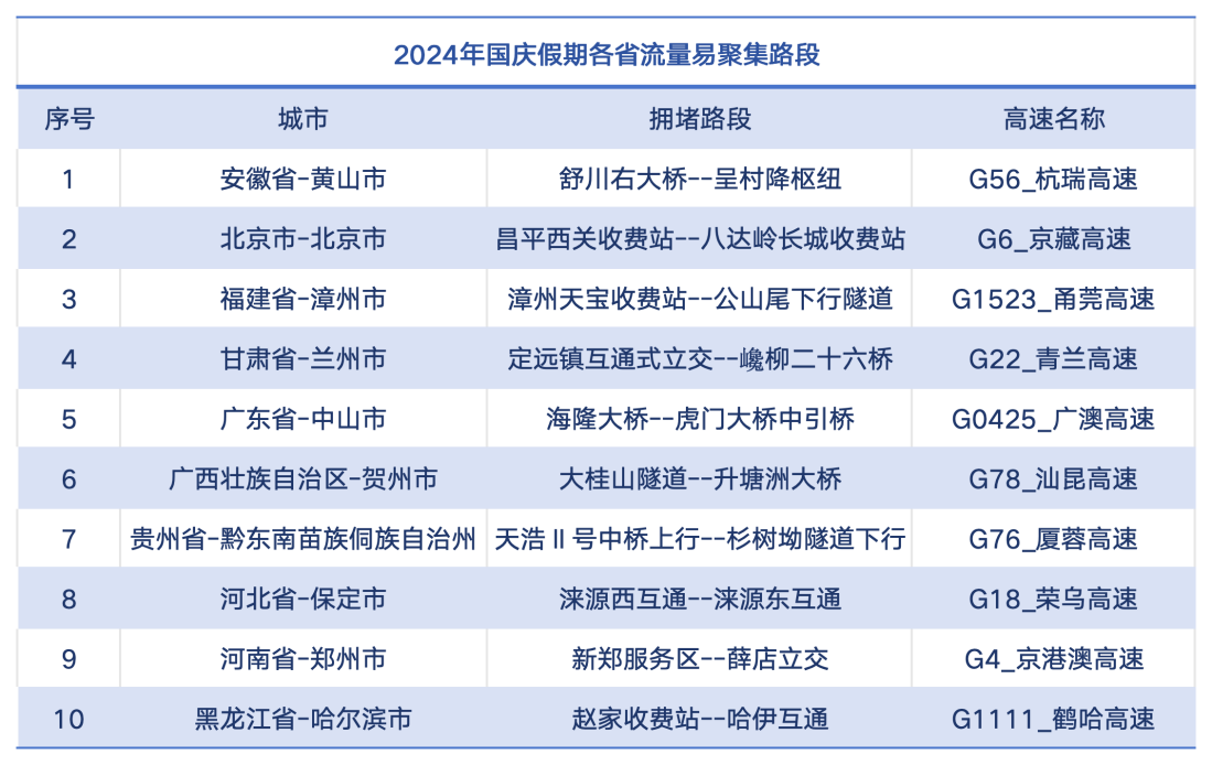 国庆假期自驾出行需求大量释放,带来全国路网流量压力增大。《报告》显示,今年“十一”期间流量易聚集路段预计多发于京津冀、长三角、成渝双城和珠三角四大重点区域以及陕西省、河南省、湖南省等旅游热门省份。假期内流量易聚集路段如下所示:
