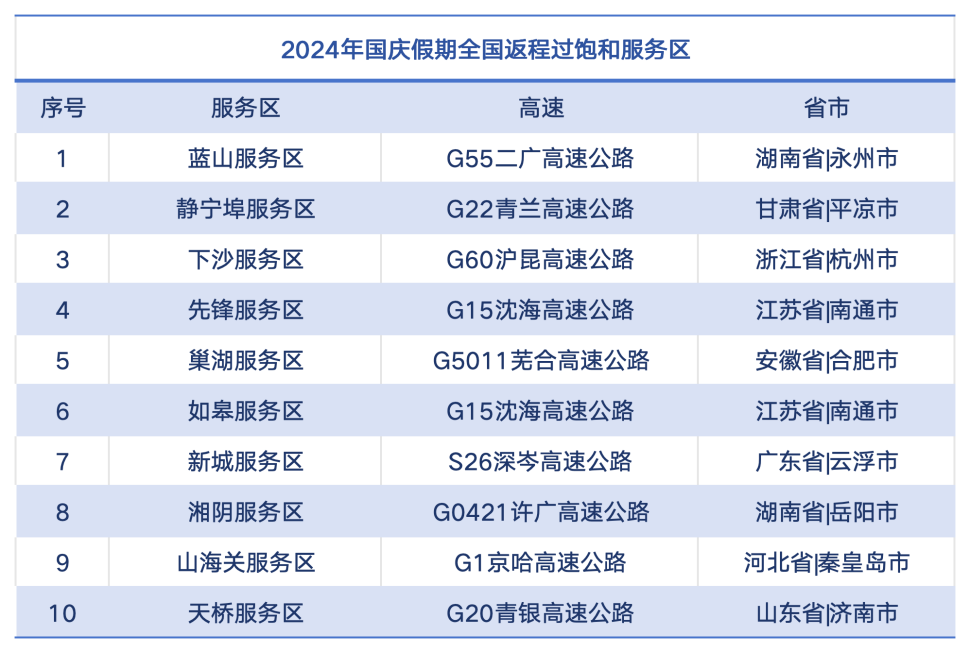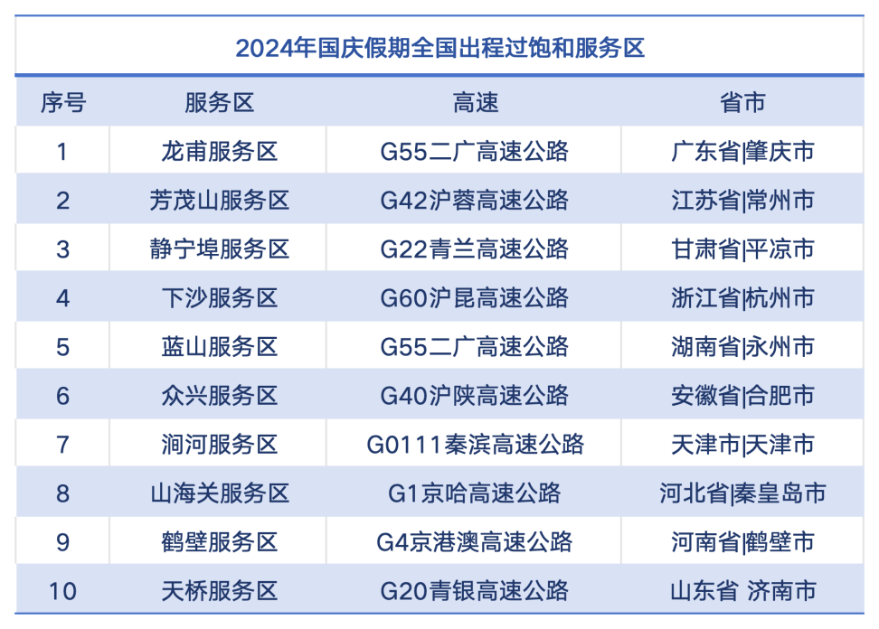 自驾出行的兴盛,也对社会公共服务提出了更新更高的要求。假日期间,受通行车辆数量等因素影响,南方省份的服务区饱和度普遍比北方压力更大一些,其中长三角地区服务区压力普遍较大。假期内过饱和服务区如下所示:
