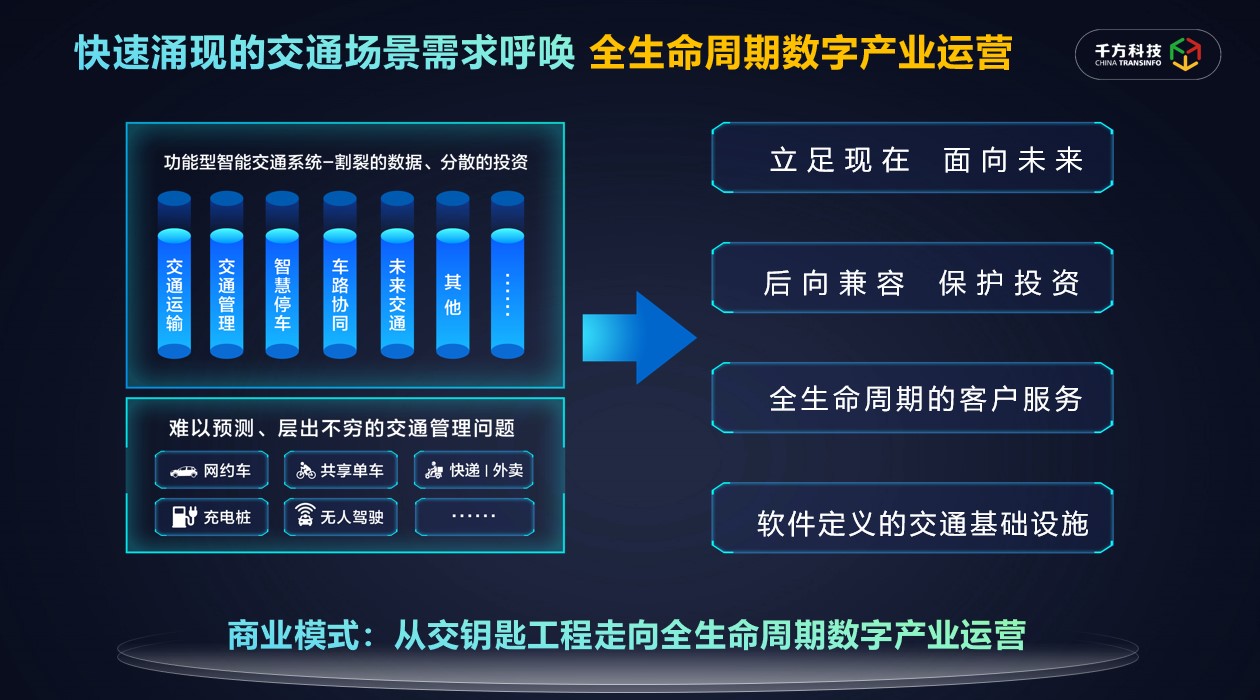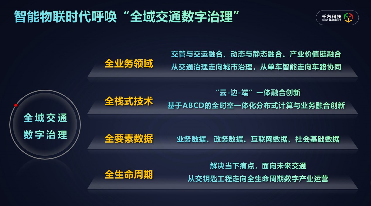 千方科技认为,当前,工业化、信息化和数智化三化叠加导致中国交通步入“无人区”,应对日趋复杂的交通问题呼吁全业务领域数字治理,以顺应从单项治理走向综合治理、从交通治理走向城市治理、从单车智能走向车路协同的行业趋势。同时,智能物联时代一个重要变化是从功能驱动走向场景驱动,需要基于场景的云边端全栈式技术融合创新。数字孪生技术可以优先用于服务交通行业,基于ABCD的全时空一体化分布式计算与业务的融合创新将在其间发挥日益重要的作用。