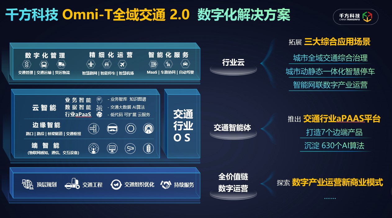 千方科技此次发布的Omni-T2.0全域交通解决方案,基于全业务领域、全栈式技术、全要素数据和全生命周期运营的全域交通数字治理关键要素,拓展三大典型应用场景,并推出行业首个“基于交通智能体的城市全域交通综合治理解决方案”、“城市动静态一体化智慧停车方案”和“智能网联数字产业运营方案”。同时,方案推出交通行业首个aPAAS平台,并探索了数字产业运营新商业模式。
