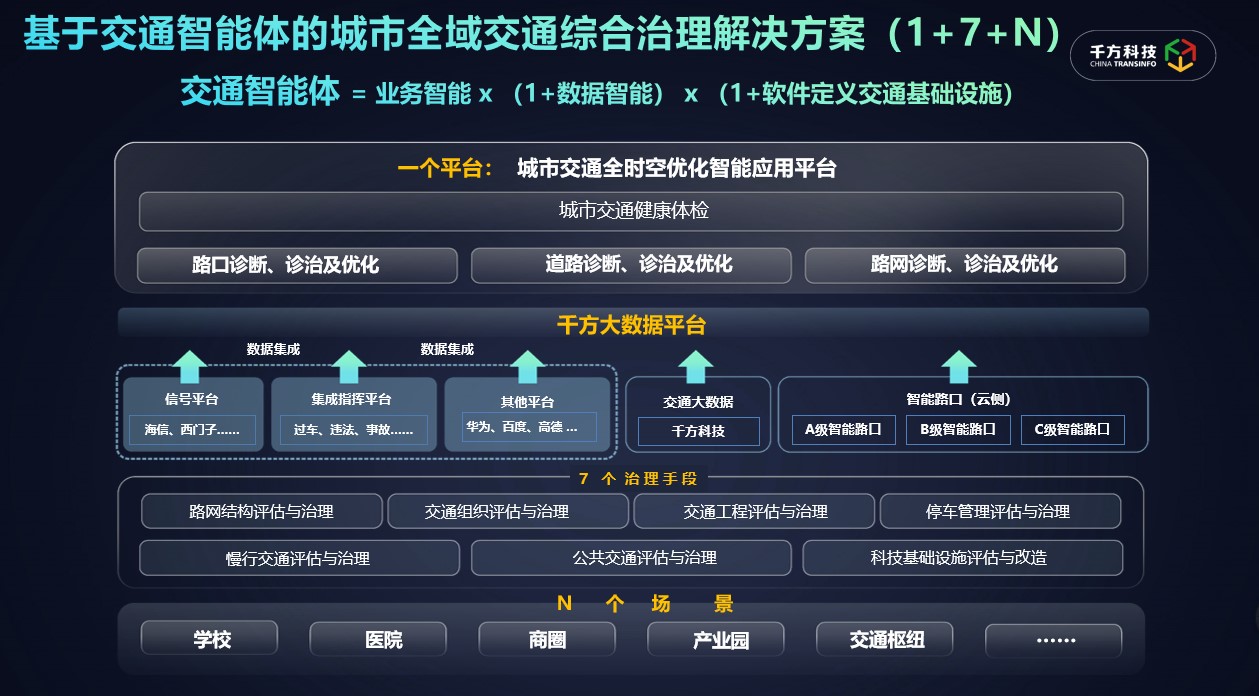 针对城市交通缓堵治乱难题,千方科技提出“基于交通智能体的城市全域交通综合治理解决方案”。这一解决方案采用“1+7+N”业务架构,即1个城市交通全时空优化智能应用平台;7大治理手段包括路网结构评估与治理、交通组织评估与治理、交通工程评估与治理、停车管理评估与治理、慢行交通评估与治理、公共交通评估与治理、科技基础设施评估与改造;N则是指涵盖医院、学校、商圈、产业园、交通枢纽在内的城市交通治理多个场景。该方案基于千方科技深耕交通行业21年扎实积淀的业务经验沉淀出业务智能,并融合数据智能,综合施策实现精细化智能化缓堵治乱,同时通过软件定义交通基础设施满足客户未来需求迭代要求。