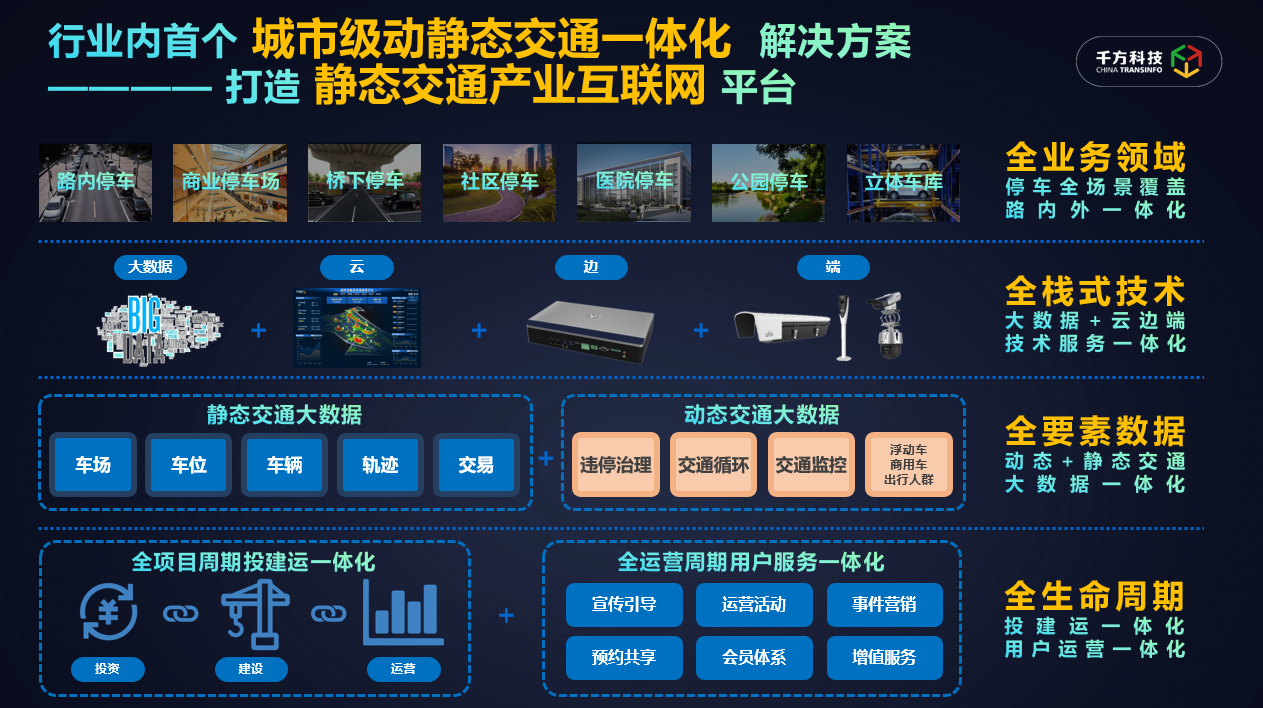 本次大会千方科技还发布了行业首个城市级动静态交通一体化解决方案。该解决方案是千方科技Omni-T全域交通解决方案 “四全”关键要素的全面落地,可实现路内路外停车场景全覆盖,包含路内停车、商业场所、桥下停车、社区停车、医院停车、公共停车、地下车库等;依托大数据+云边端融合的全栈式技术、动静态一体化的全要素数据,实施投建运一体化、用户运营一体化的全生命周期服务。该方案是业内首次将动态交通数据应用于静态交通综合治理,并通过打造静态交通产业互联网平台实现客户价值倍增。