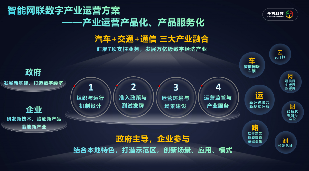 针对自动驾驶从示范到商业化试点的启航,千方科技基于2015年至今在自动驾驶车路协同技术产品和解决方案,以及自动驾驶示范测试服务方面的沉淀和打磨,将服务于北京亦庄高级别自动驾驶示范区道路测试的能力和经验进行产品化,提出“智能网联数字产业运营方案”,可为各地自动驾驶示范区提供组织与运行机制设计、准入政策与牌照发放、运营环境与场景建设、运营监管与产业服务,通过标准化的服务型产品助力城市发展智能网联产业,继续助推自动驾驶商业化进程。