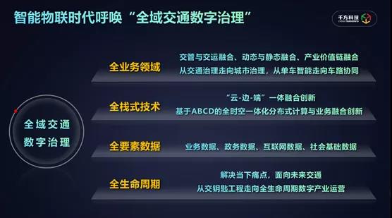 在第十六届ITS中国智能交通年会上,千方科技总裁潘璠对“千方科技Omni-T全域交通解决方案”进行迭代升级,提出了“智能物联时代呼唤全域交通数字治理”的论断,并对全域交通的“四全”要素——全业务领域、全栈式技术、全要素数据和全生命周期的核心内涵进行了深度阐释。