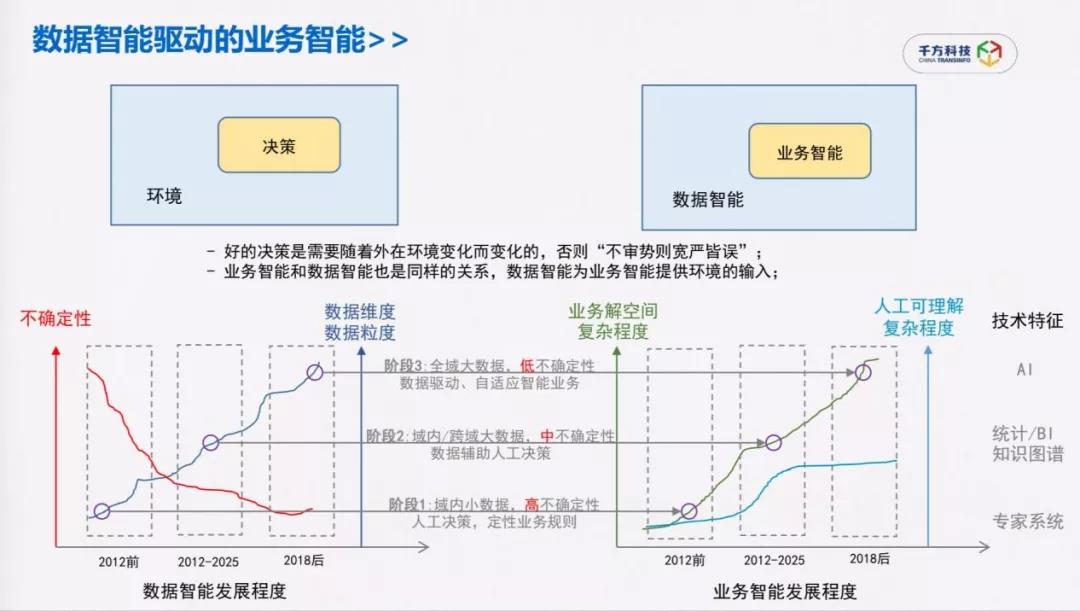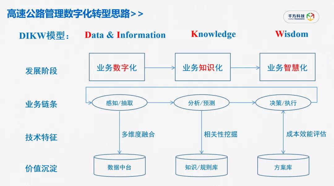 郭胜敏介绍道,在高速公路管理数字化转型方面,千方科技的思路是从业务数字化到业务知识化,再到业务智慧化。而作为第一步的业务数字化,需要充分利用数字化技术带来的数据智能驱动,为业务智能提供动态环境的输入。