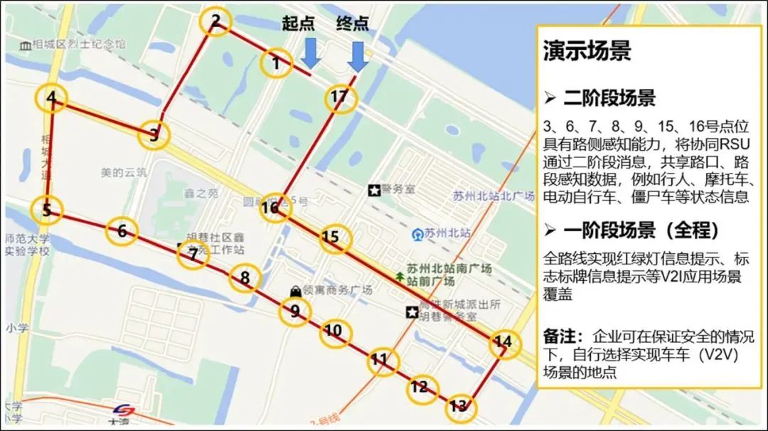 “四跨”应用场景演示实践活动包括一阶段和二阶段应用场景的演示。一阶段应用实践依托苏州市相城区高铁新城车联网基础设施,开展车辆驾驶安全预警、路侧交通信息提示等一阶段车与车、车与路全场景应用验证。二阶段应用验证在部分重点路段,将路侧感知设施识别到的行人、机动车、非机动车等交通参与者信息,通过二阶段消息集及时下发给周边车辆,验证路侧赋能车辆提升对“鬼探头”、“转弯盲区”等难题的识别能力,探索网联赋能智能驾驶和智慧交通应用价值。