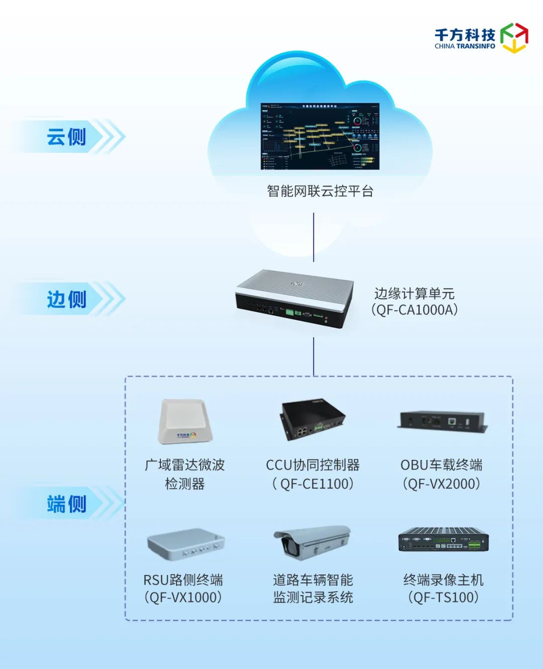 作为国内车路协同自动驾驶技术路线的发起者之一,千方科技已完成了路侧+车端的完整产业链布局,并拥有涵盖智能网联云控平台、ECU边缘计算单元、OBU车载终端、RSU路侧终端、广域雷达微波检测器等在内的全系自研产品。