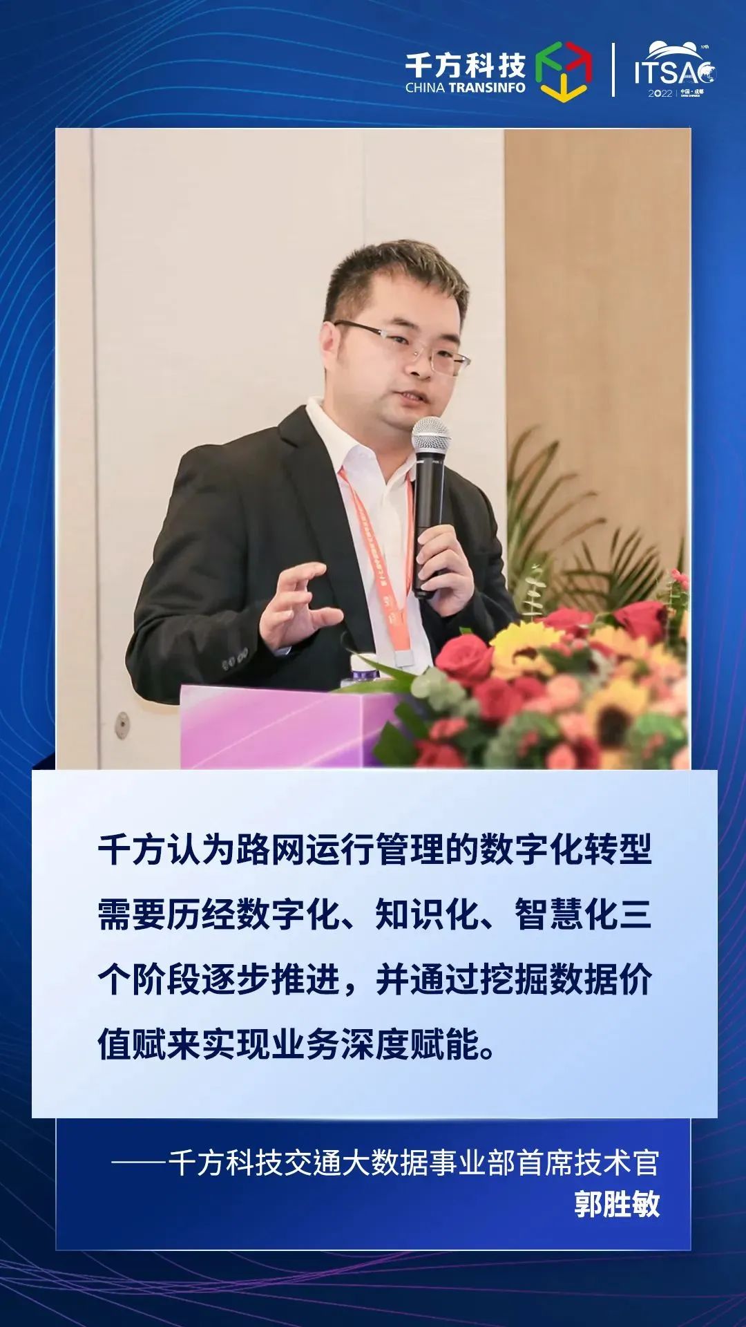 11月10日上午,第十七届ITS中国智能交通年会在成都举办。千方科技交通大数据事业部首席技术官郭胜敏博士应邀出席,并在“交通数字化发展论坛”做主旨演讲,以路网运行管理数字化转型为切入点,分享了千方科技在构建数据智能驱动的业务智能,深化各级业务融合协同,赋能路网运行监测管理等方面的探索与实践。