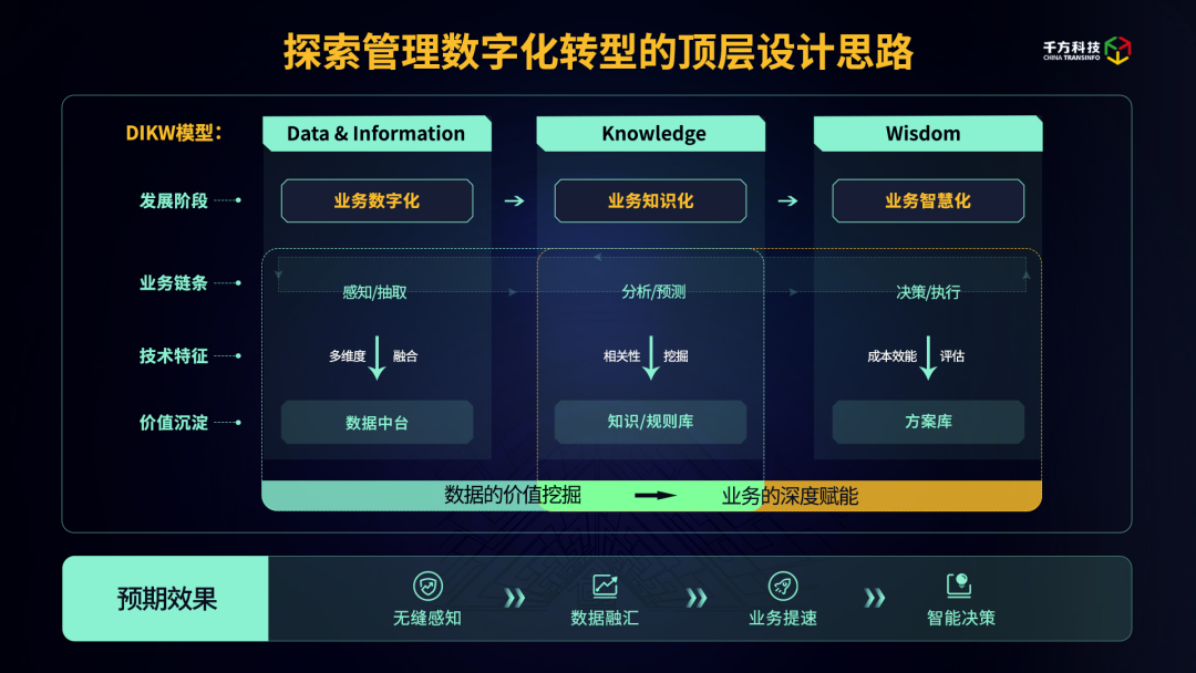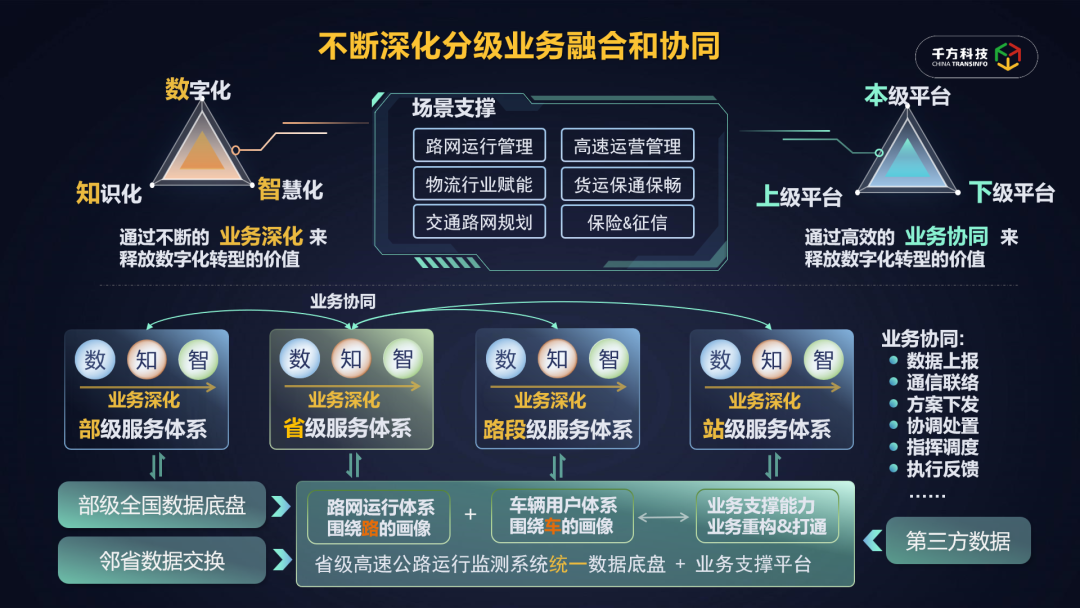 首先,在数字化阶段,千方科技致力于繁荣交通大数据生态,基于打造全国公路行业“一张图”,构筑了完备的数据融合治理能力,并逐步完善公路网运行的数据中台指标体系;其次,基于业务场景凝练出多种数据画像模型和AI分析算法,形成面向全域交通治理的业务知识库和规则库,这是业务知识化的过程;最后,以数字化和知识化能力为驱动,不断探索系统运行的安全和效率边界,生成平衡成本和效能的最优决策方案,这是进阶业务智慧化的过程。