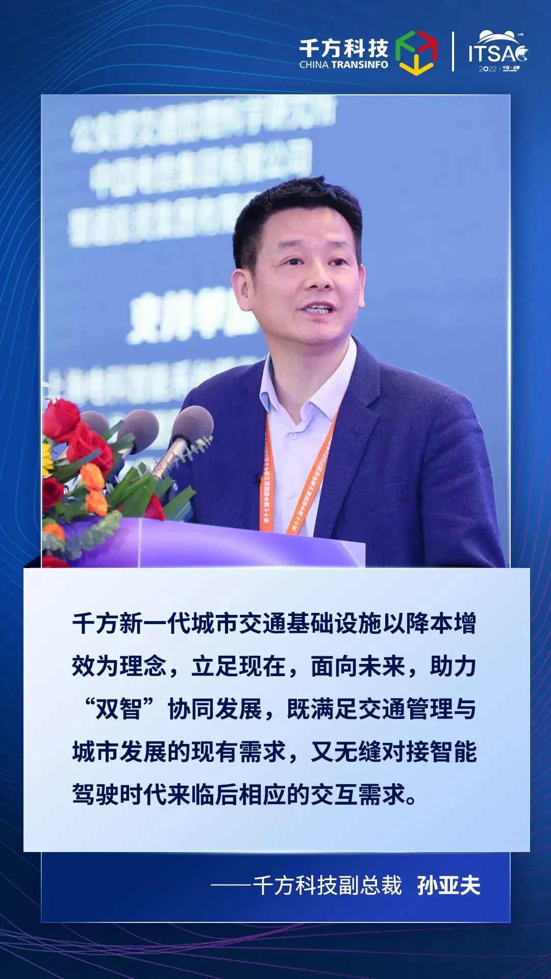 千方科技副总裁孙亚夫出席大会,并在主论坛做“降本增效,新一代城市交通基础设施建设思路探索”主旨演讲,围绕交通系统新特征、新趋势、新需求,分享了千方科技以降本增效为理念,以路口智能化建设为核心,构建新一代城市交通基础设施的思路与探索。