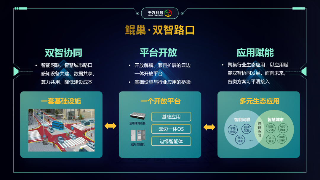 千方科技发布的新一代城市交通基础设施“鲲巢·双智路口”,由一套基础设施、一个开放平台、多元生态应用组成。融合千方科技长期积累的交通优化模型算法、交通工程基础理论、行业专家业务经验,以及大数据、人工智能、数字孪生、云计算等新技术,构建智能路口云控平台,实现路口时间层面的信号控制自主优化和空间层面的交通组织优化,实现面向交通管理业务的真正智能化。由生态伙伴共建智能路口基础设施,以开放平台作为基础设施与行业应用的桥梁,通过应用赋能推动智能网联与智慧城市(交通)协同发展。降低基础设施总体成本,提升基础设施综合效能,打造新基建时代下交通路口新标杆。