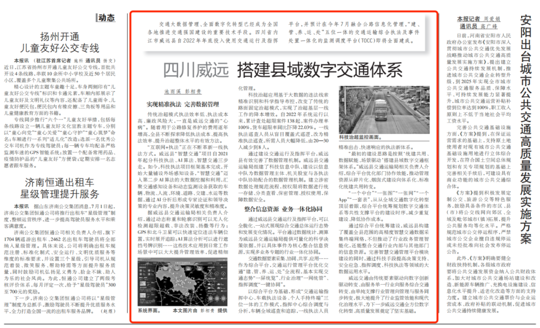 近日,《中国交通报》报道了千方科技协助四川省内江市威远县搭建县域数字交通体系,加速威远交通全方位数字化转型,助力国家成渝地区双城经济圈建设的最新成果。
