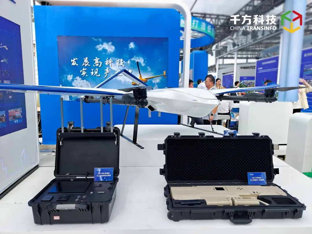 本次会场展出的千方QCW-10型垂直起降固定翼无人机,其动力系统采用电动和油动双系统,续航能力达3-5小时,可负载10-15kg,能广泛应用于民用测绘、遥感、巡检、应急等多个场景。此外,博览会现场还展示了多款无人机监测反制装备,产品融合TDOA、AOA、电磁压制、信号诱骗、多频段反制等多种无线电技术,实现100MHz-6GHz超宽频段监测和大范围精准管制,通过区域模块化部署实现平滑扩容与多级联防,为低空安全运行提供有效保障。