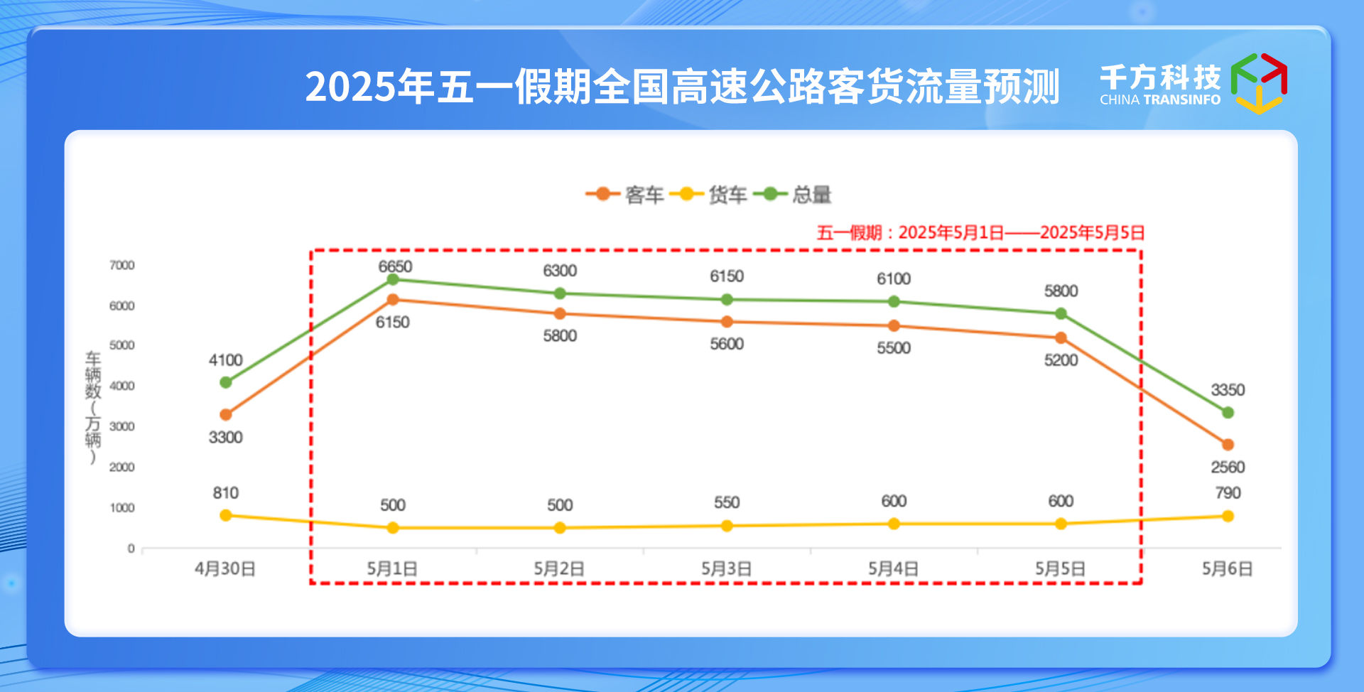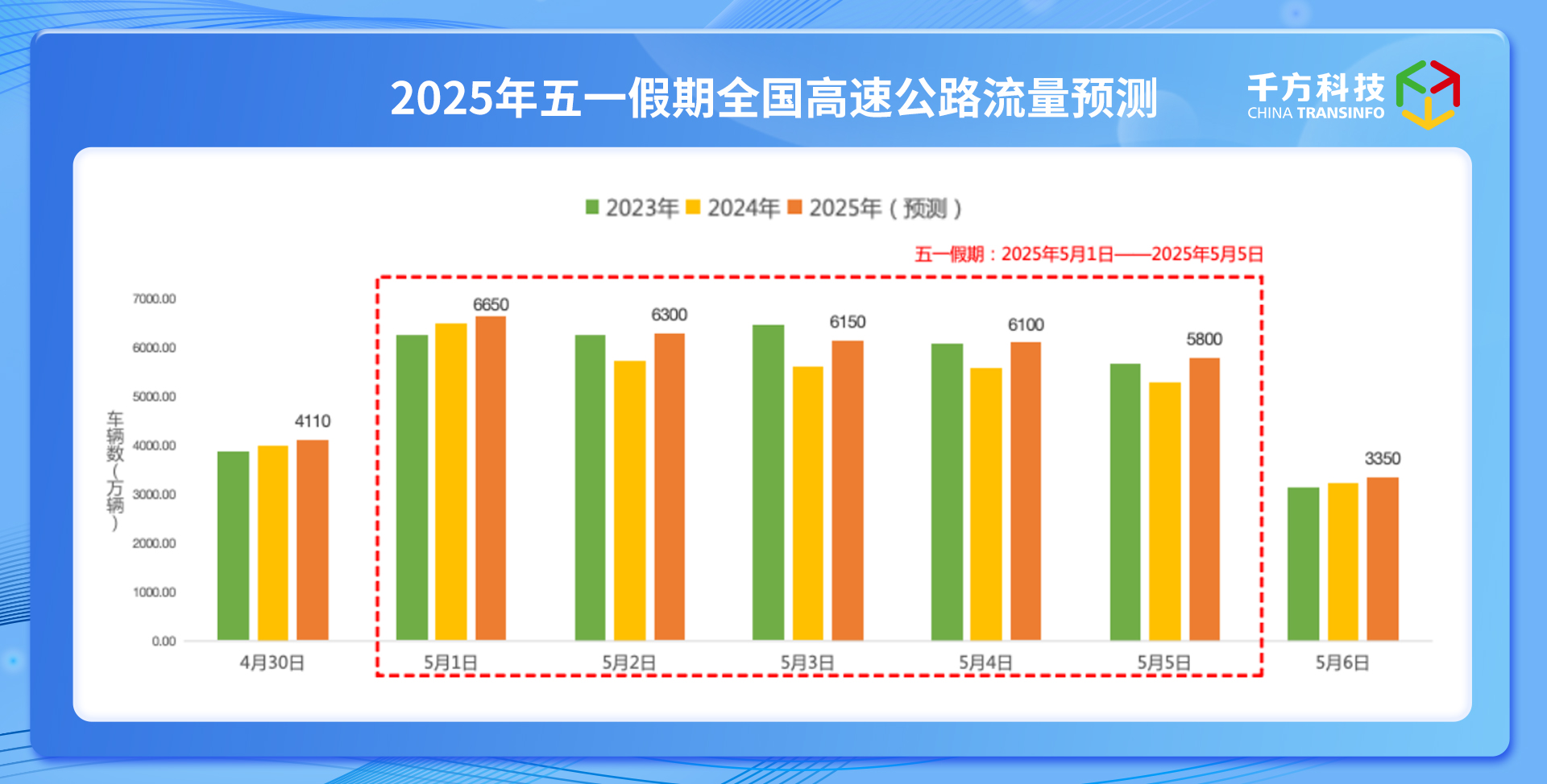 2025年“五一”期间,预计全国高速日均流量约为6200万辆,同比2024年增长8.1%,其中5月1日或现峰值,预计达6650万辆,约为平日流量的2.1倍,创历年五一单日流量新高。