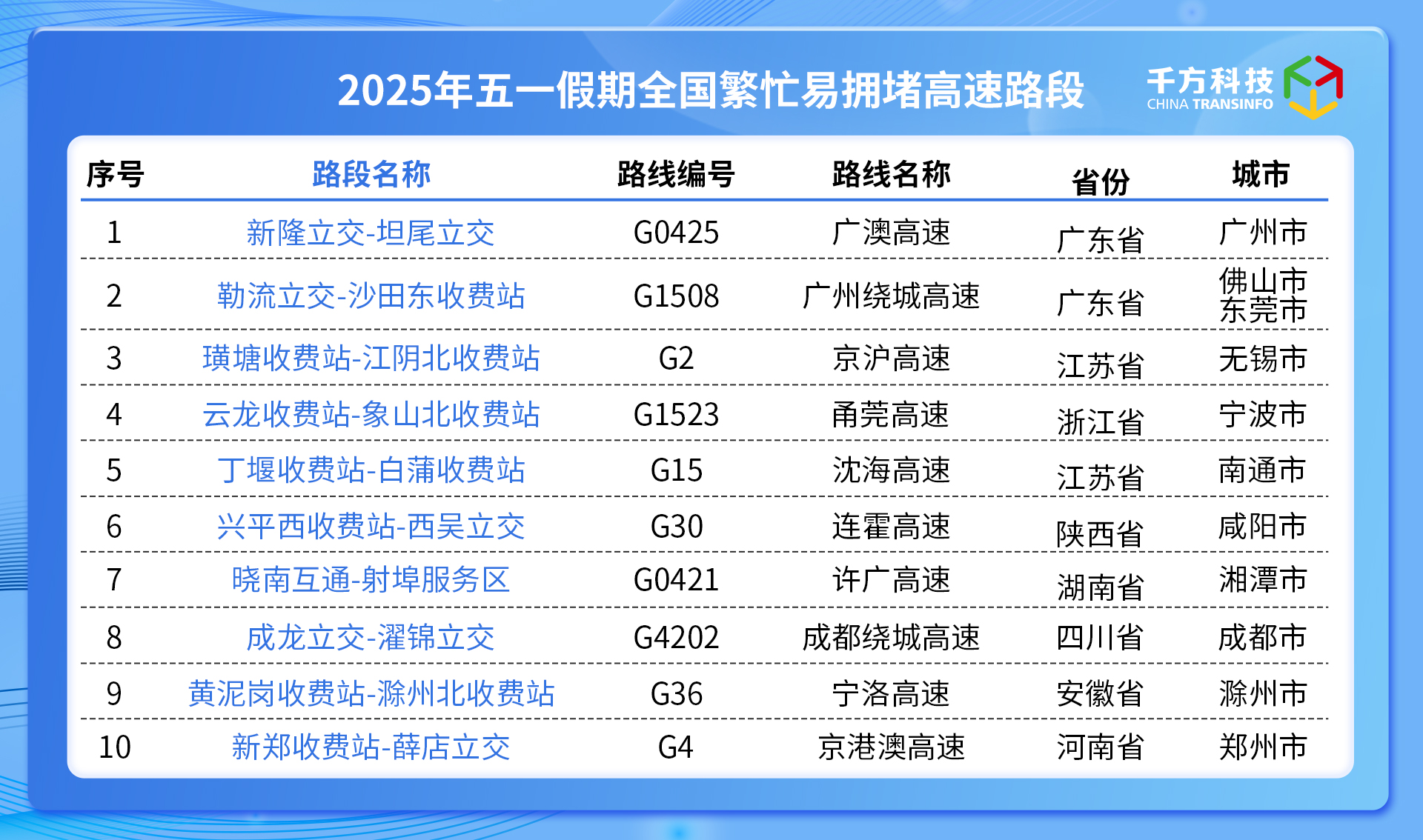 “五一”假期自驾游热度攀升,全国多地高速通行压力显著。预计北京、上海、广州、成都等人口密集城市进出城高速及机场高速易发生拥堵缓行,杭州、西安、长沙、青岛、洛阳、武汉等热门旅游城市周边高速、景区周边高速也将迎来大流量。同时,三亚、珠海、平潭、舟山等沿海城市因天暖看海热潮,可能出现局部阶段性交通压力上升。