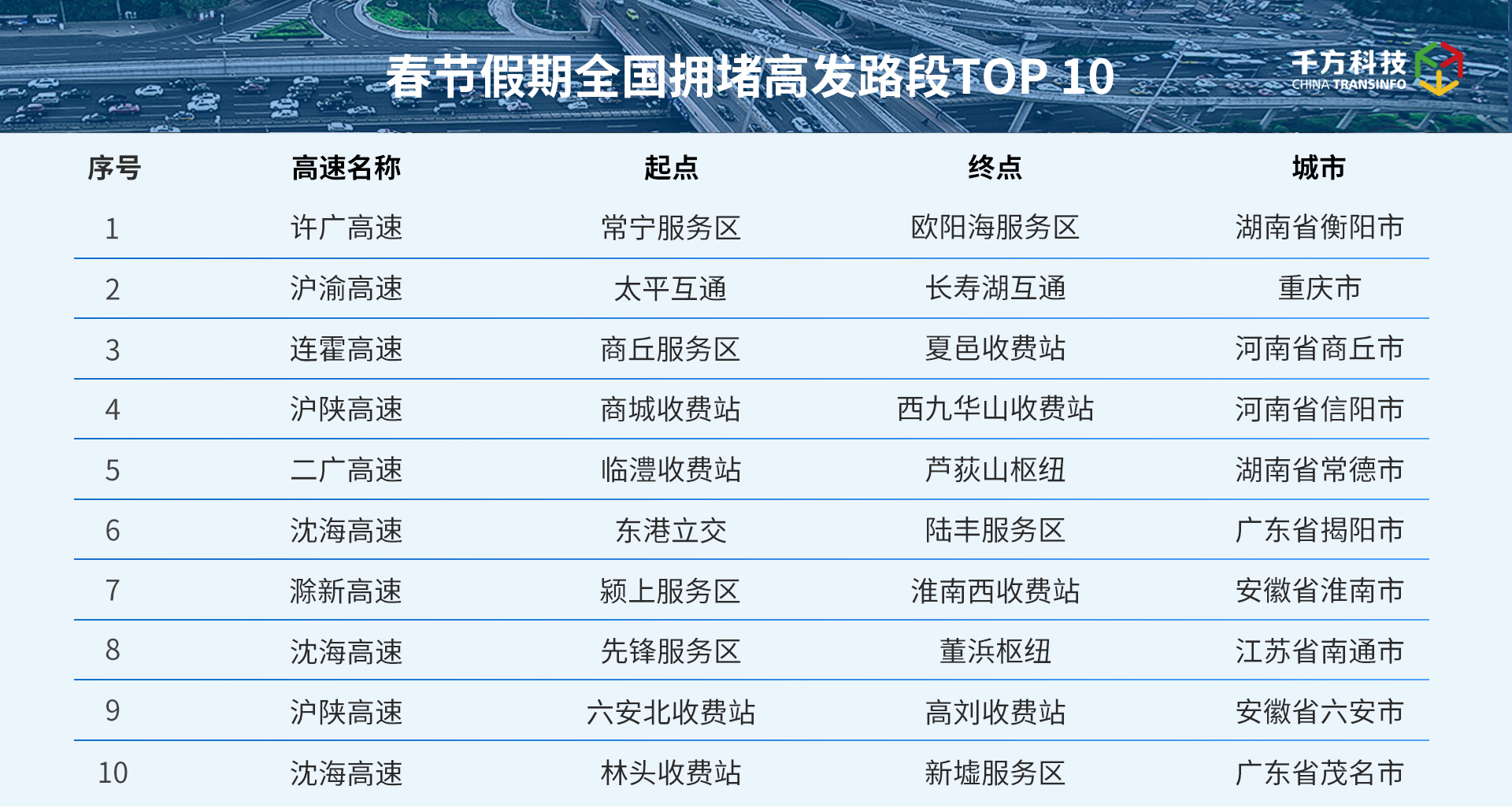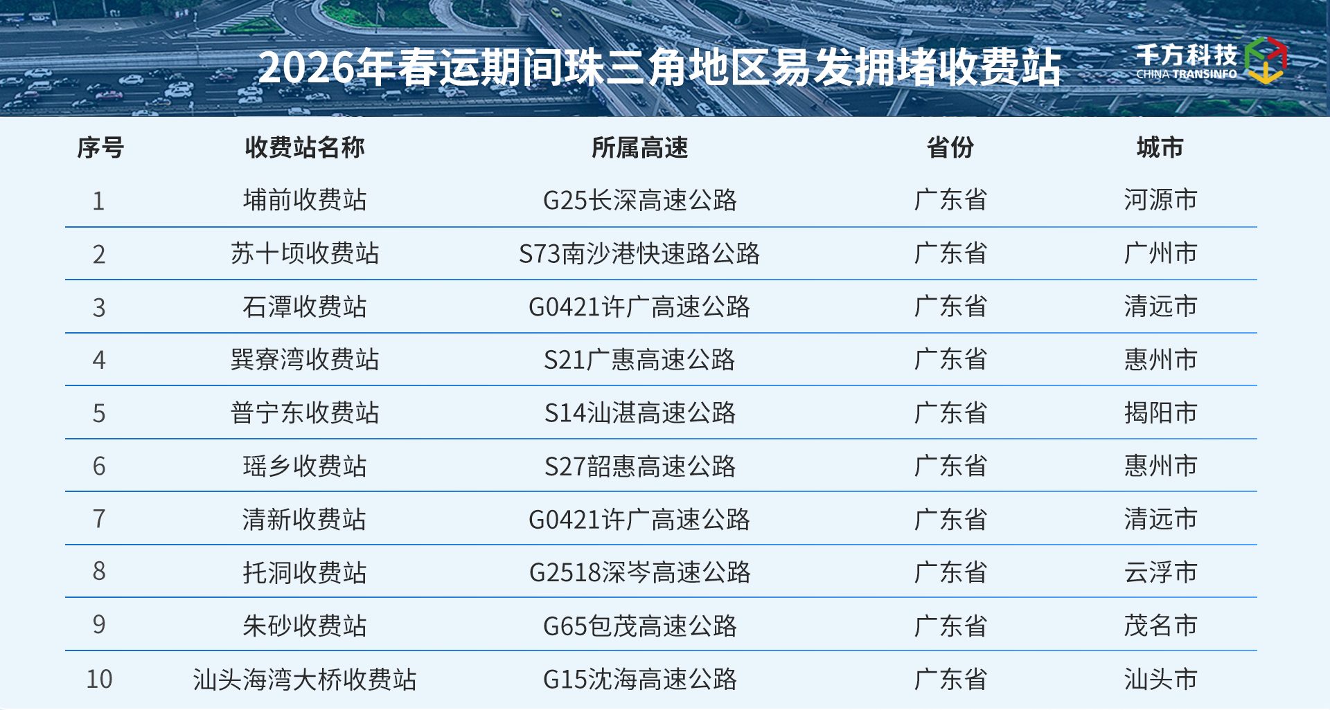 根据《报告》,今年春运前期,珠三角区域交通流量与平日基本持平。作为重要的劳动力输入地,珠三角地区在春节期间流量较平日有所下降,呈现“净流出”状态。春运后期,虽然人员逐渐回流,该地区日均流量仍略低于平日水平。春运期间,珠三角地区易拥堵节点如下所示: