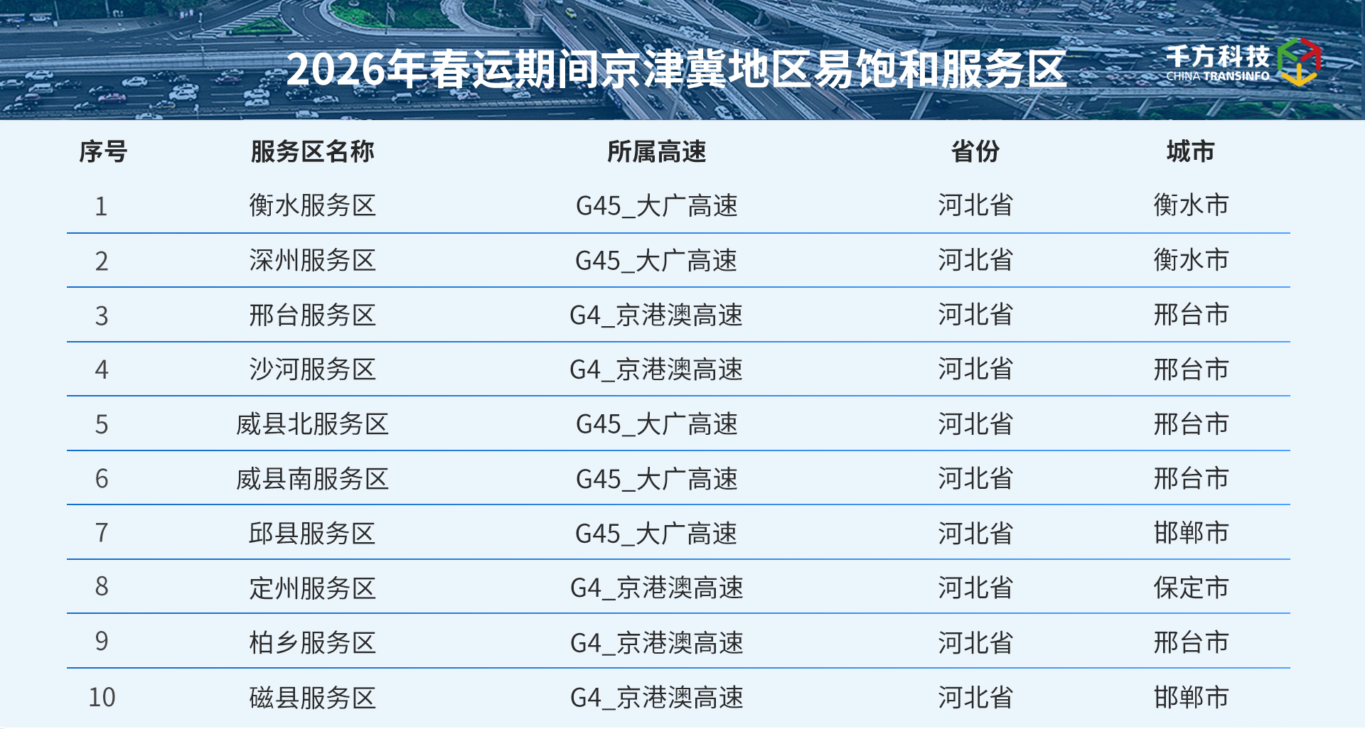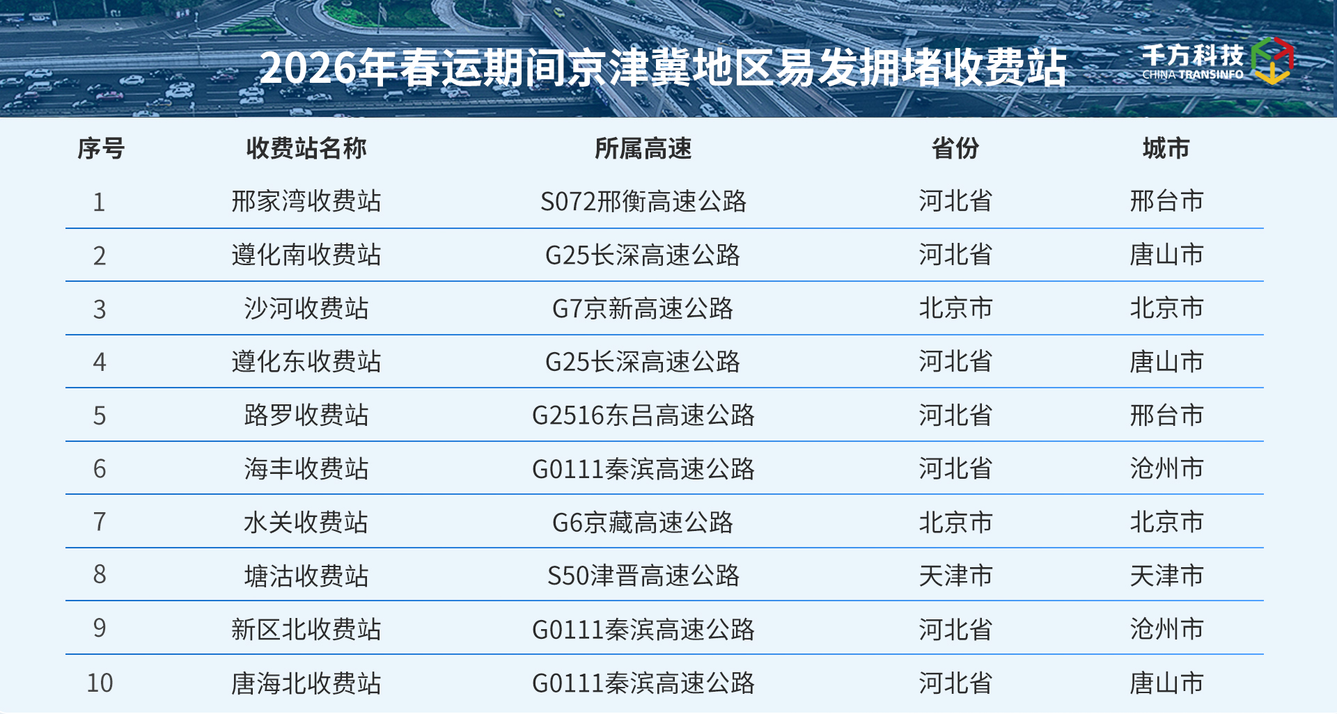 根据《报告》,今年春运前期,部分人员提前离京,该地区流量较平日有所下降,并在春节期间逐步恢复至平日水平。春运后期,受返程高峰带动,该地区流量预计将较平日显著上升,整体呈现“V型”走势。春运期间,京津冀地区易拥堵节点如下所示:
