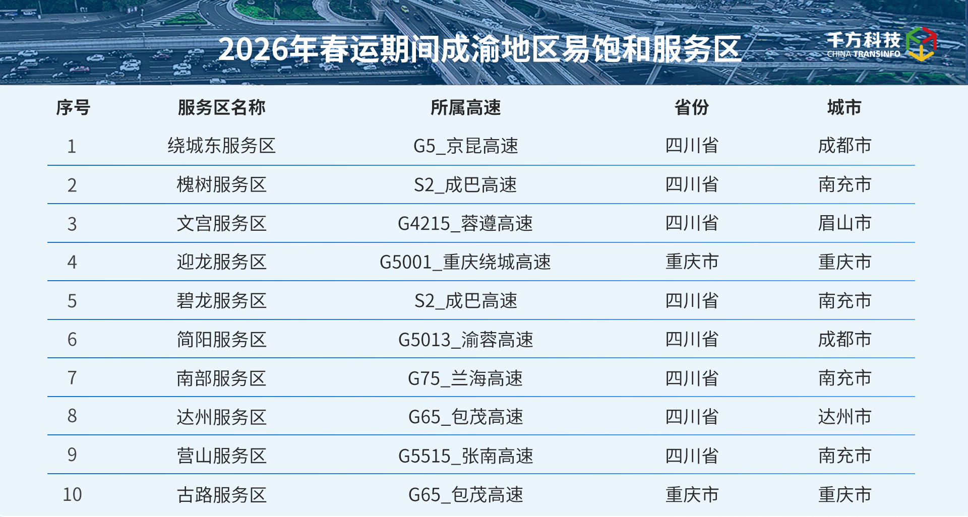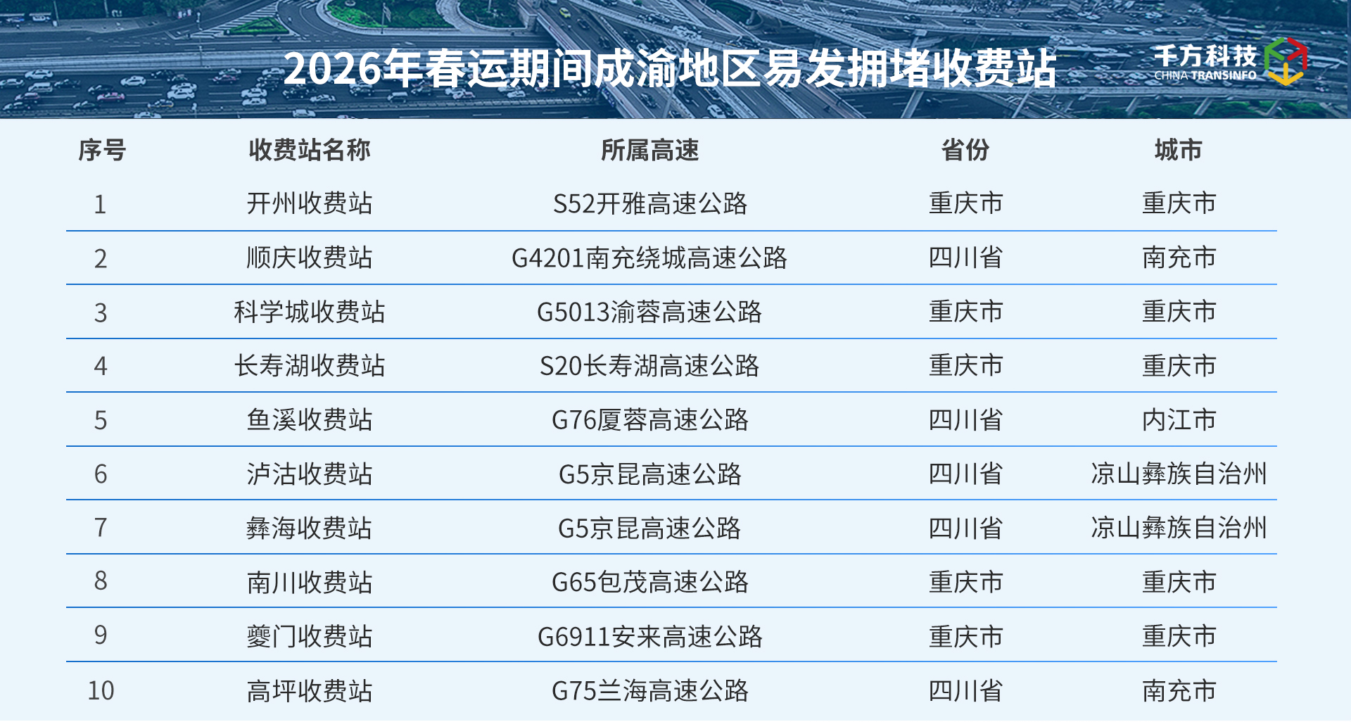 根据《报告》,今年春运期间,成渝区域日均流量同比2025年相对持平。作为重要的劳动力输出地,成渝地区返乡流量在春运前期率先释放。春节期间,该地区流量较平日显著上升,成为四大区域中增幅最大的区域。在春运后期,该地区流量仍高于平日。春运期间,成渝地区易拥堵节点如下所示: