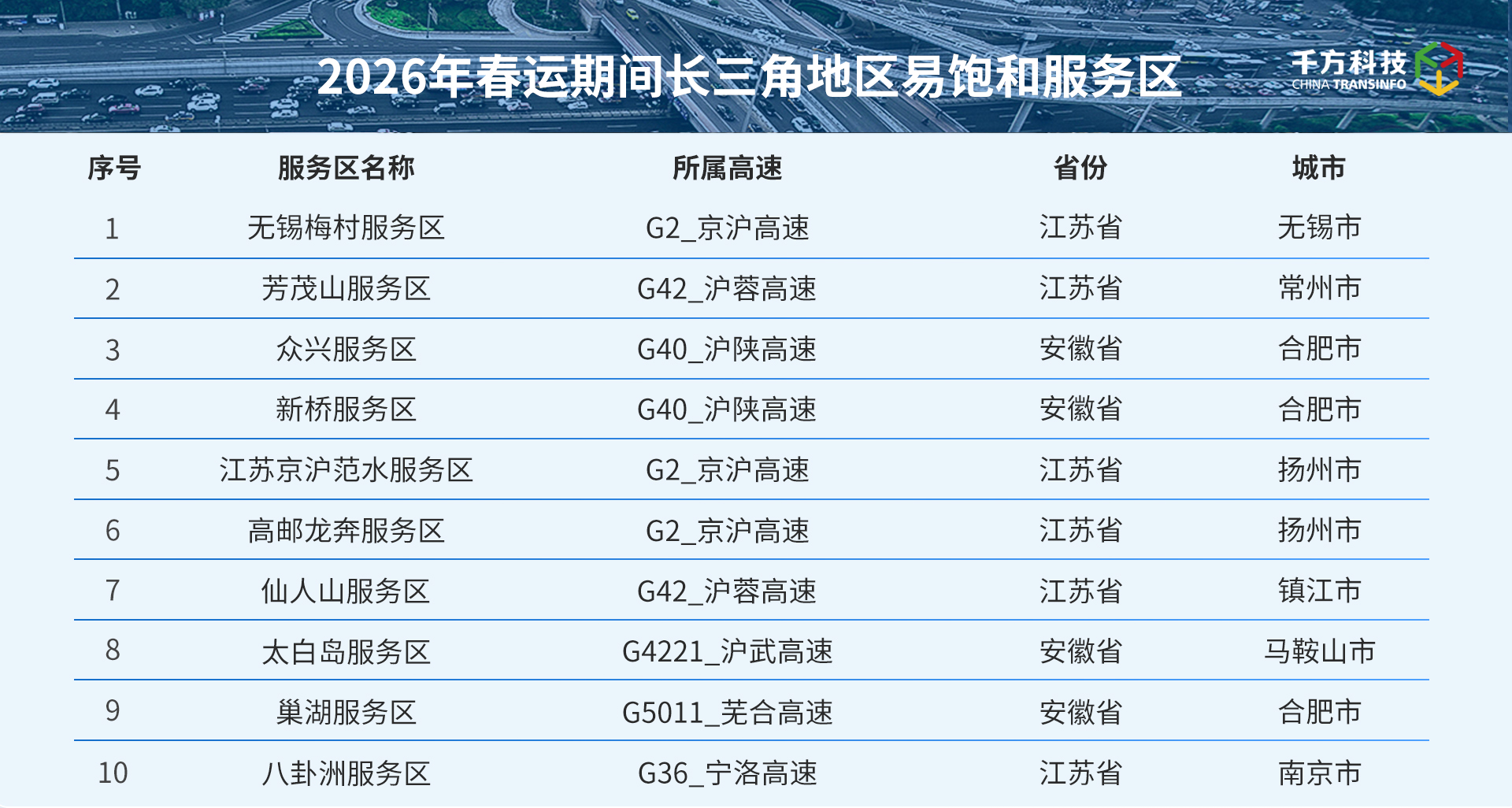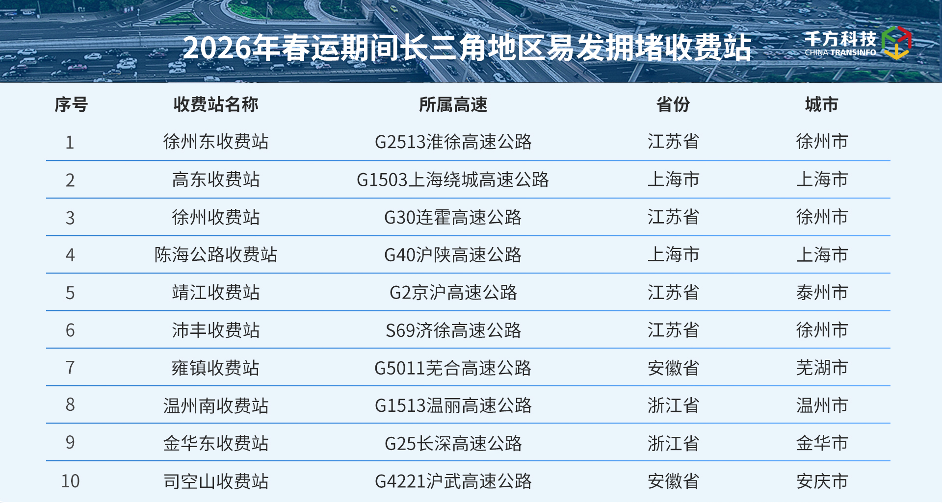 根据《报告》,今年春运期间,长三角区域日均流量预计在四大区域中同比2025年增幅最大。春节期间,该地区日均流量较平日增幅显著,直到春运后期仍然高于平日。春运期间,长三角地区易拥堵节点如下所示: